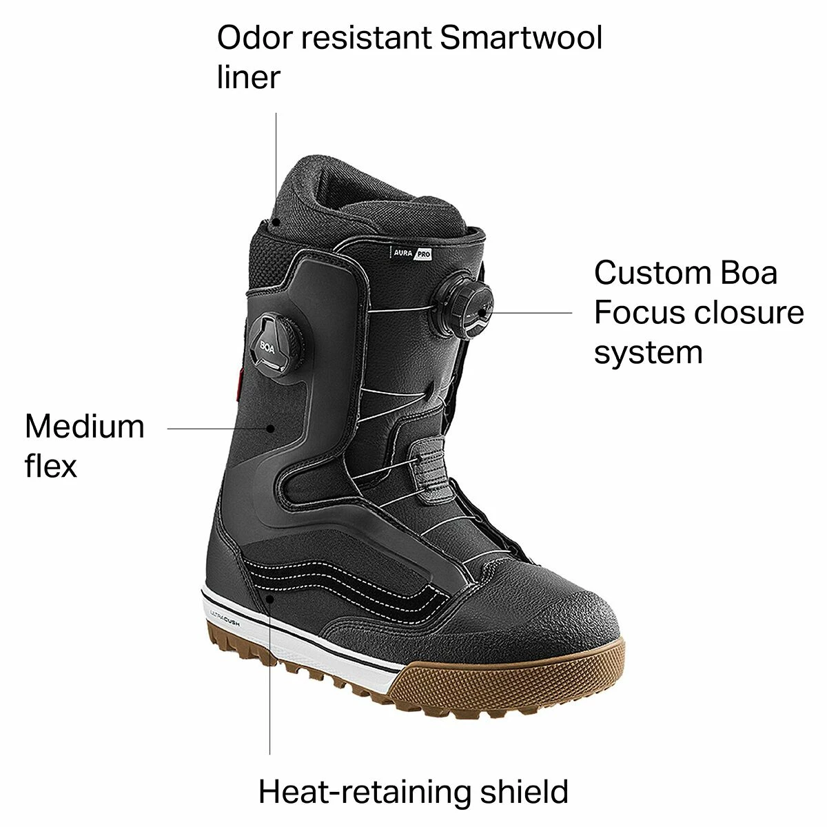 The Vans Aura Pro Boa Snowboard Boot offers all-day comfort, ease-of-use, and clean looks every time you step into them. The Boa Custom Focus system easily dials in the perfect fit every time via independent zones, and a Custom Slide Glide allows you to adjust the fit along the instep for your ideal fit and superior heel hold.