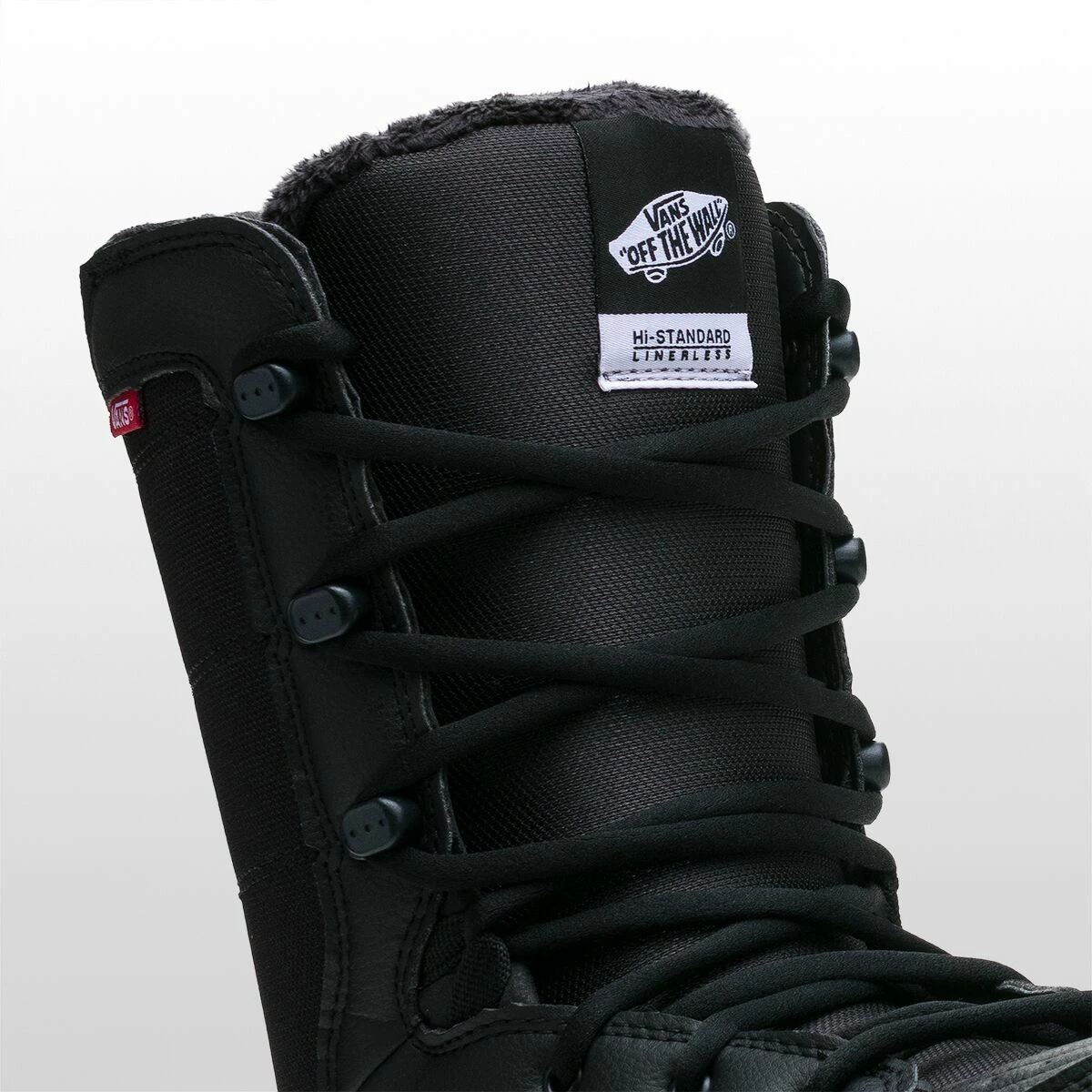 The Vans HI-Standard Linerless Snowboard Boot is built for the riders among us who love to flow through their local park or hit technical street handrails and demand a more skate-like feel and enhanced control. This boot has support and cushioning built straight into the upper so it’s able to omit a liner and create an exceptionally low profile that boosts board feel and offers the freedom of closer contact. A traditional lacing system reliably locks the heel in place and receives an assist from the added shin strap that really cranks things down for enhanced control, while the Reverse Waffle Lug outsole ensures that this low-profile boot connects well with traditional bindings.